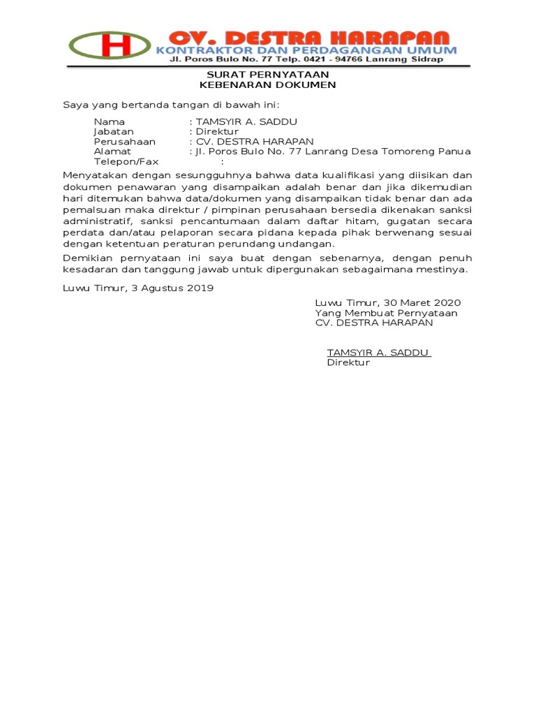 Tidak memiliki tato bagi pria dan wanita, dan tidak boleh tindik bagi pria dan tidak boleh. Berikut ini adalah sebuah contoh surat pernyataan kebenaran dan keabsahan dokumen lingkungan yang bisa anda jadikan bahan referensi. Kop suratpenerbit jaminan uang muka surat pernyataan keabsahan dan standar operasional prosedur (sop. Surat pernyataan keabsahan dan kebenaran dokumen yang bertanda tangan dibawah ini : Seluruh pernyataan data dan informasi beserta seluruh dokumen yang saya lampirkan dalam berkas pendaftaran seleksi penerimaan taruna baru politeknik kp bone tahun 2016 adalah benar.